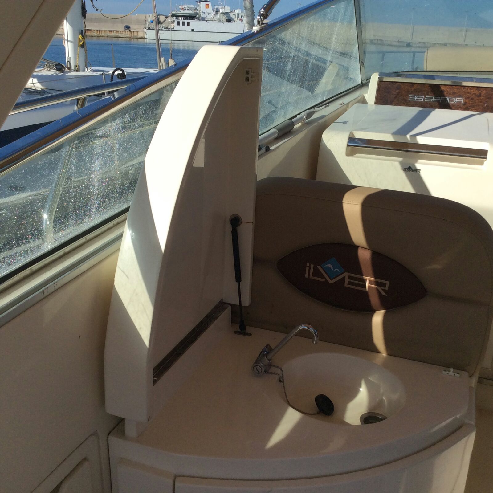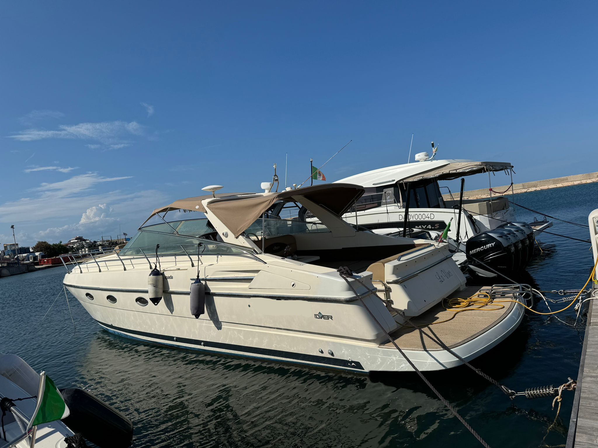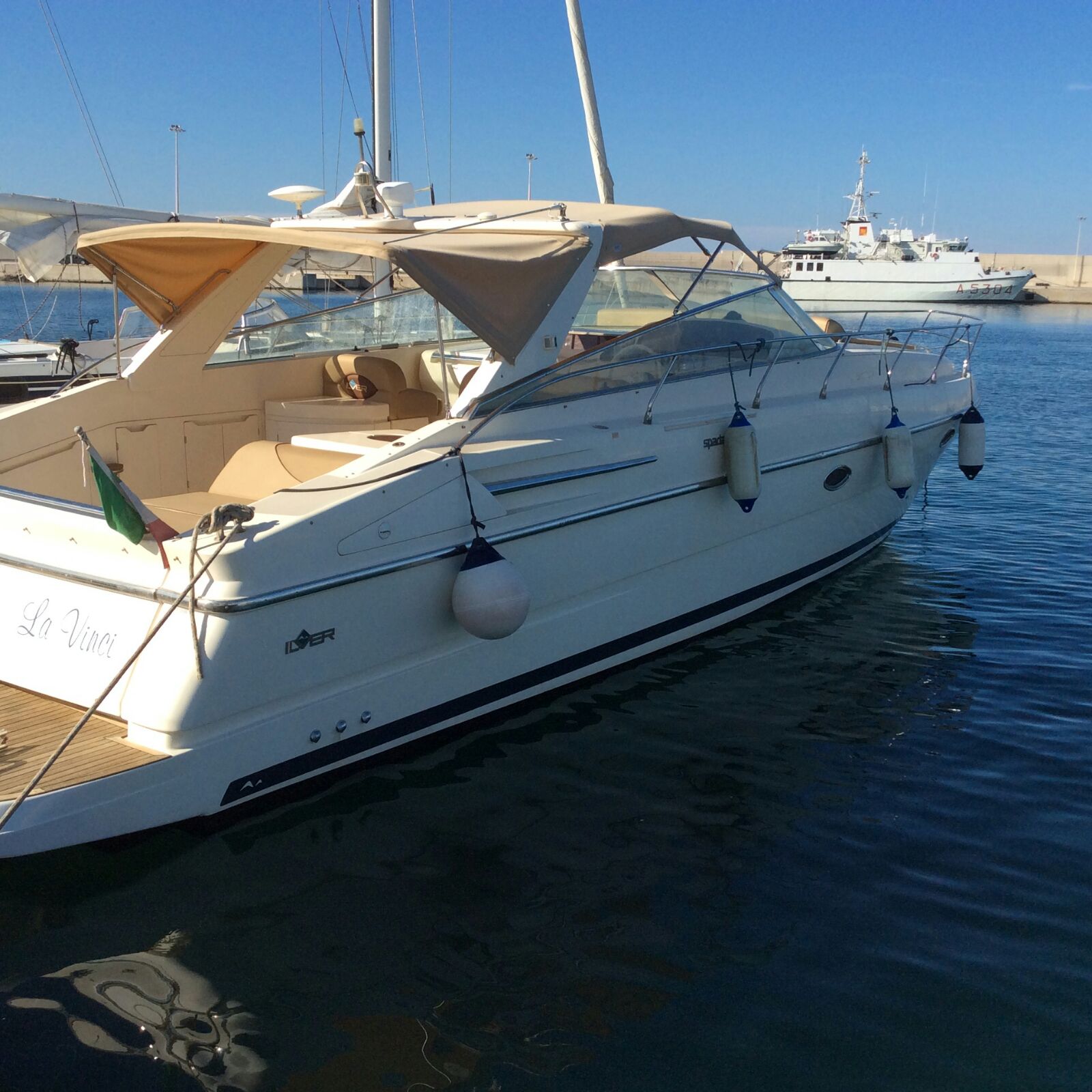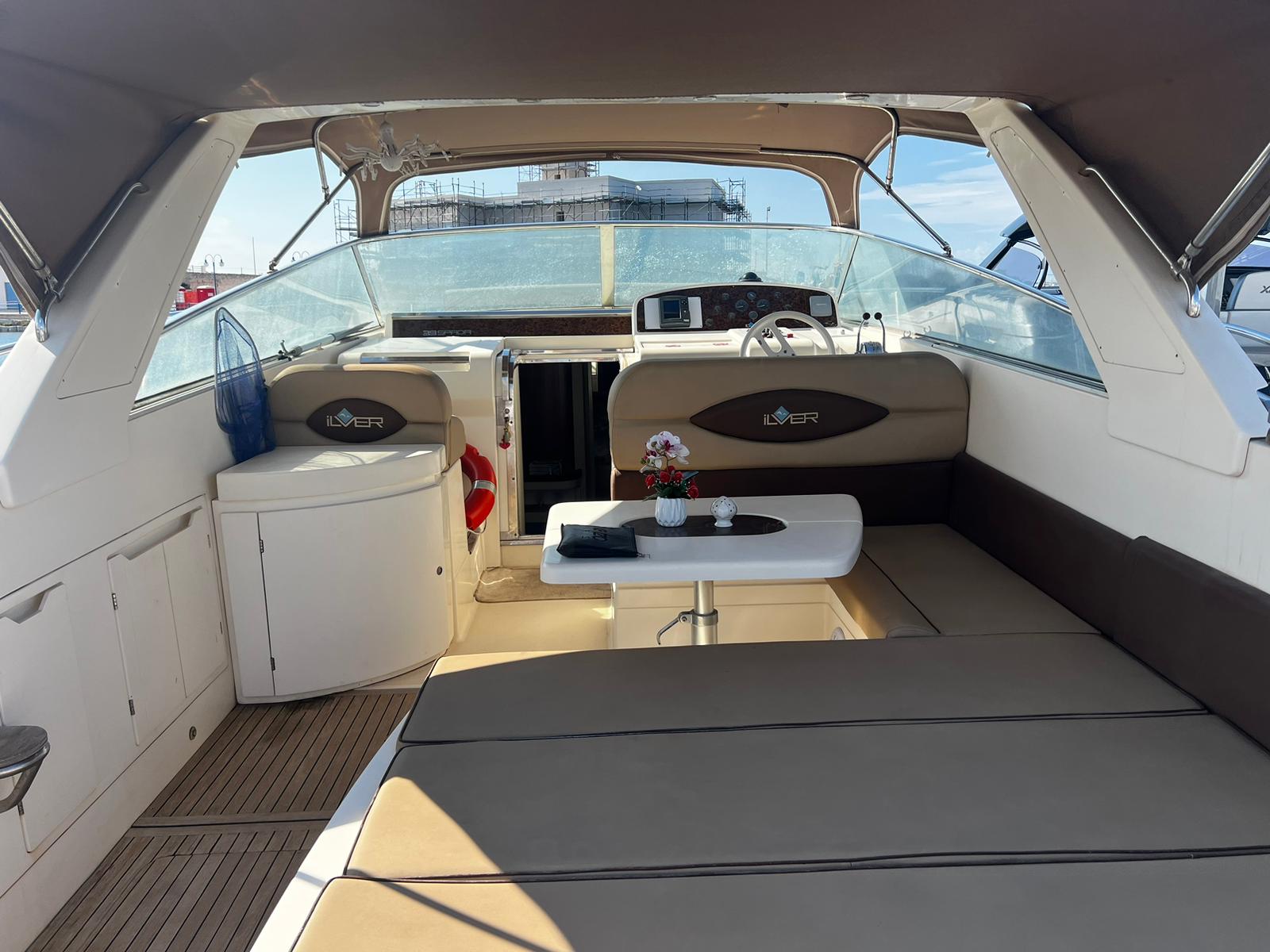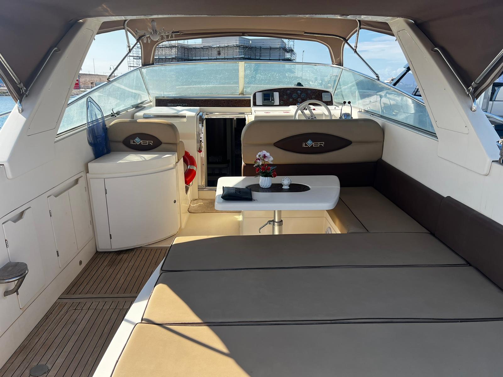 Ilver 39 Spada, Open con ampi spazi esterni ed interno. Motorizzato con 2 x 320 Mercruiser Diesel, con circa, anno 2002, N.2 cabine e N.2 bagni con dinette ed angolo cucina con pistre ad induzione,. lavello e frigorifero. Tendaggi e tendalino nuovo. Completo di elica di prua, cuscineria completa di prua e di poppa, aria condizionata, teak su piano di calpestio. Imbarcazione in ottimo stato completamente restrutturata.