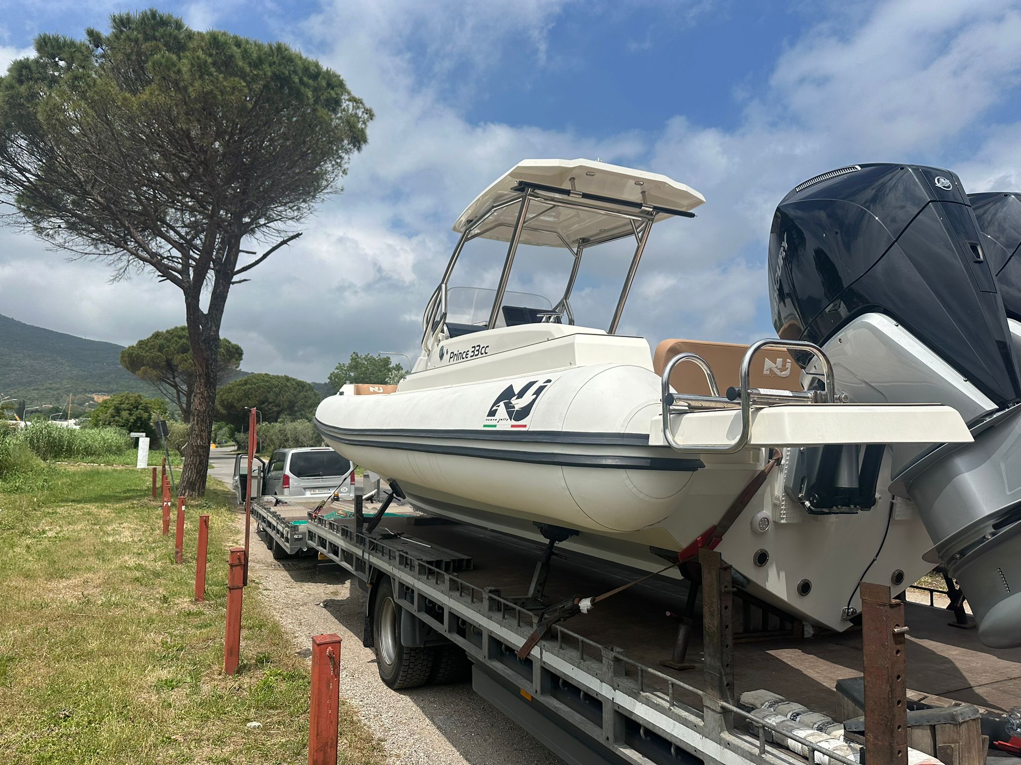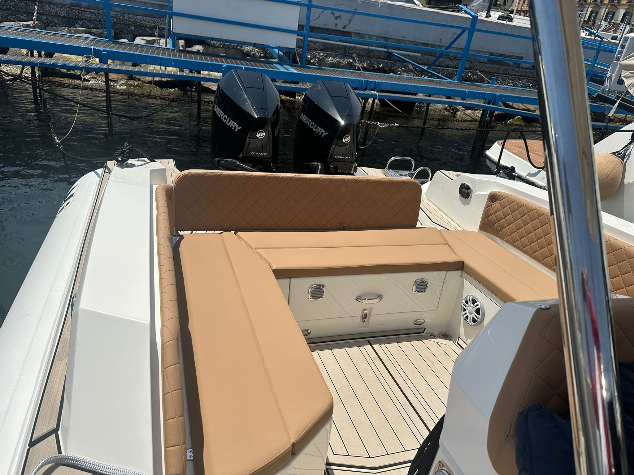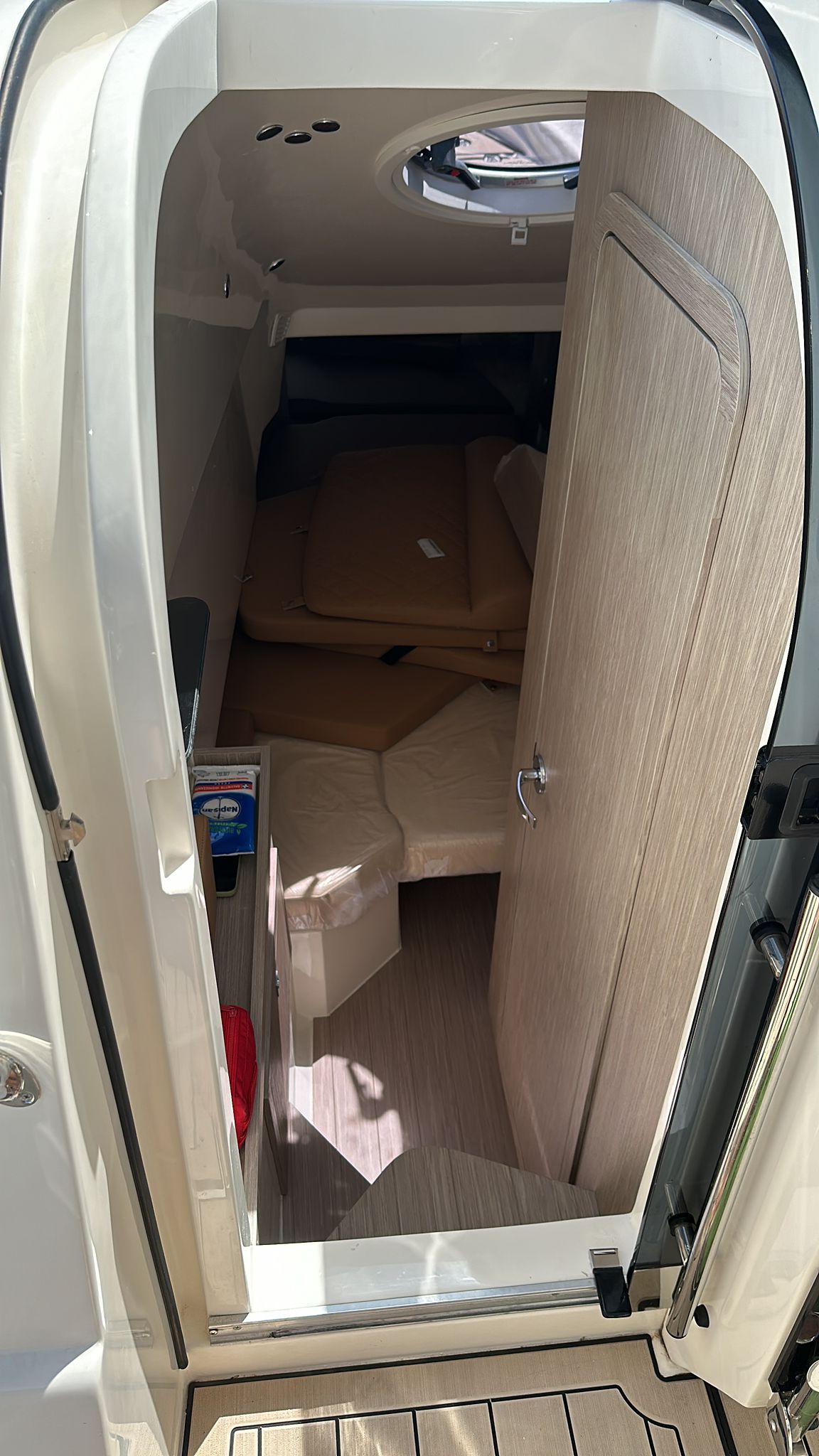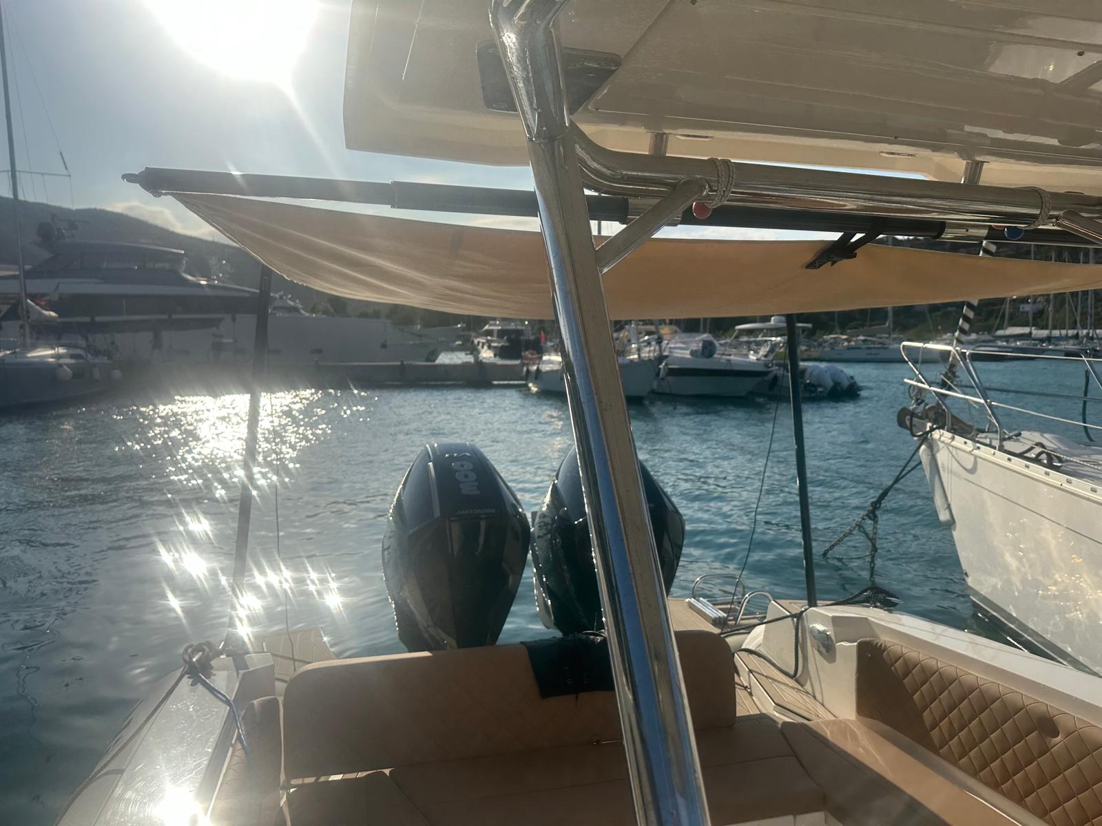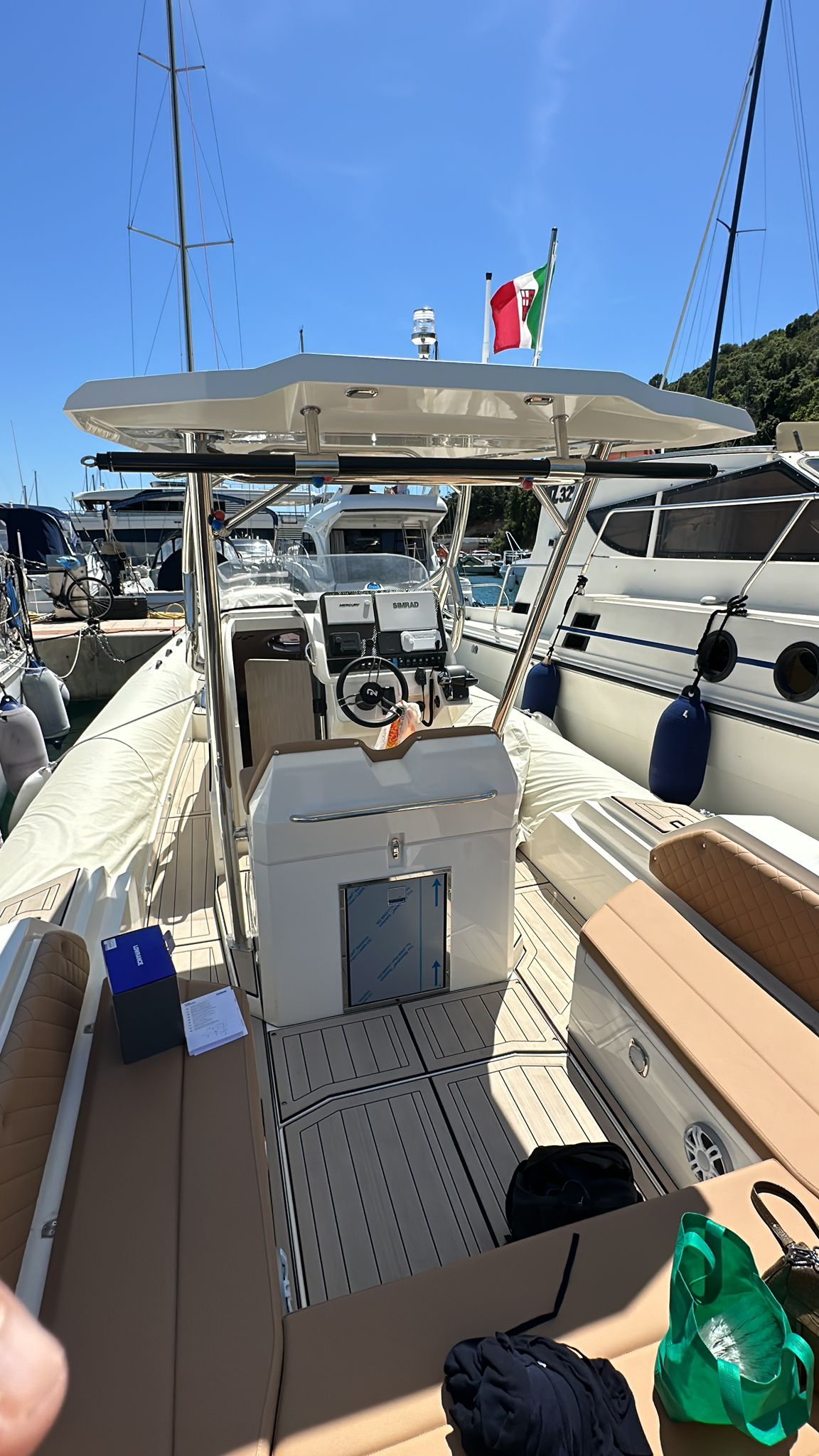 Battello Nuova Jolly 33 Prince, anno Giugno Giugno 2024 con pochissime ore di navigazione. Versione T Top con tenda copertura pozzetto con pali in carbonio. Angolo cucina esterno con lavello, N.2 fuochi a gas, frigo 42Lt . Interni composti da cabina con letto di prua, locale bagno separato con wc elettrico e lavello con doccino estraibile. Ampie spiaggetta di poppa con scaletta bagno. VHF, GPS con ecoscandaglio Simrad, Radio Hertz con altoparlanti in pozzetto.