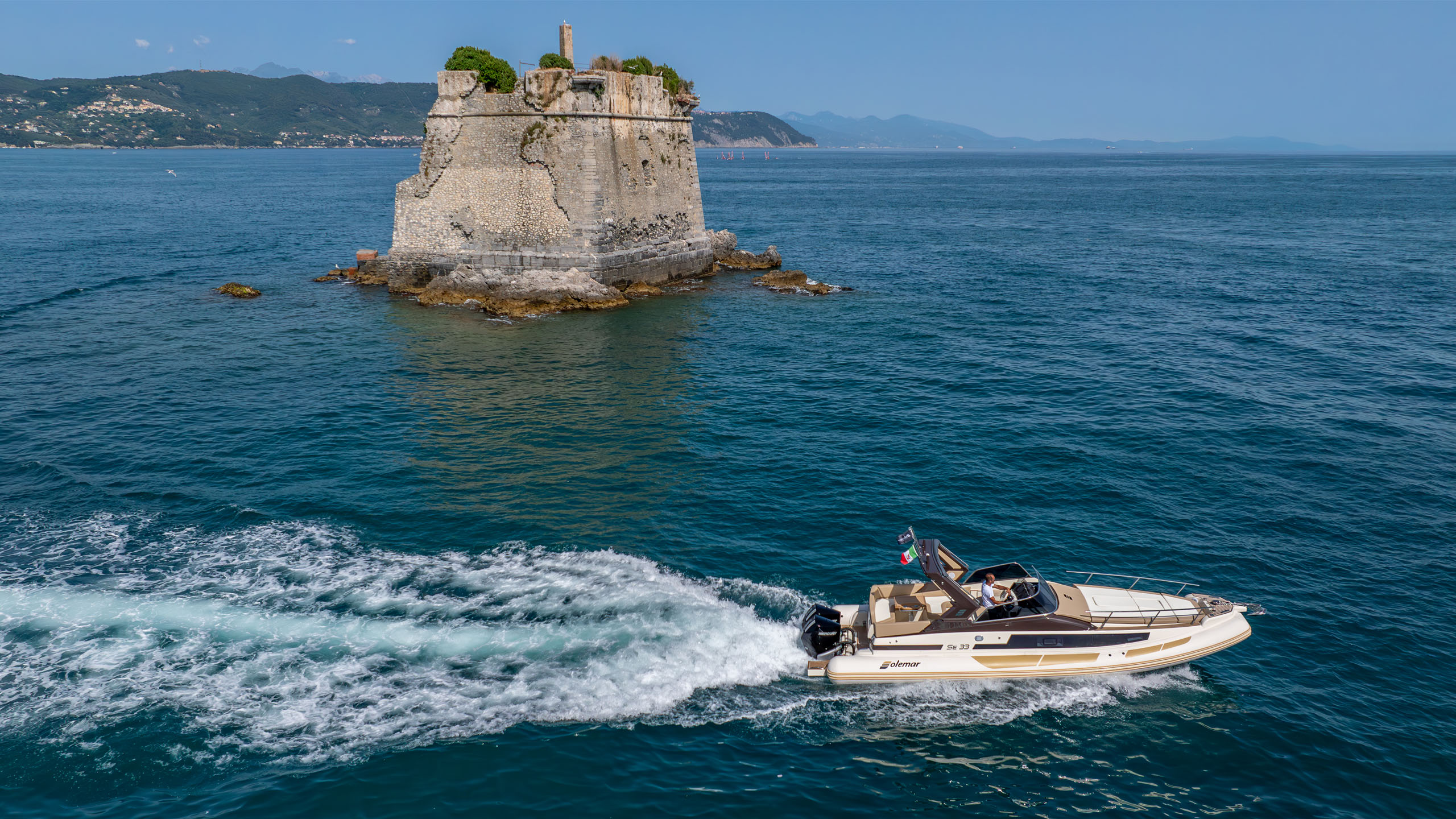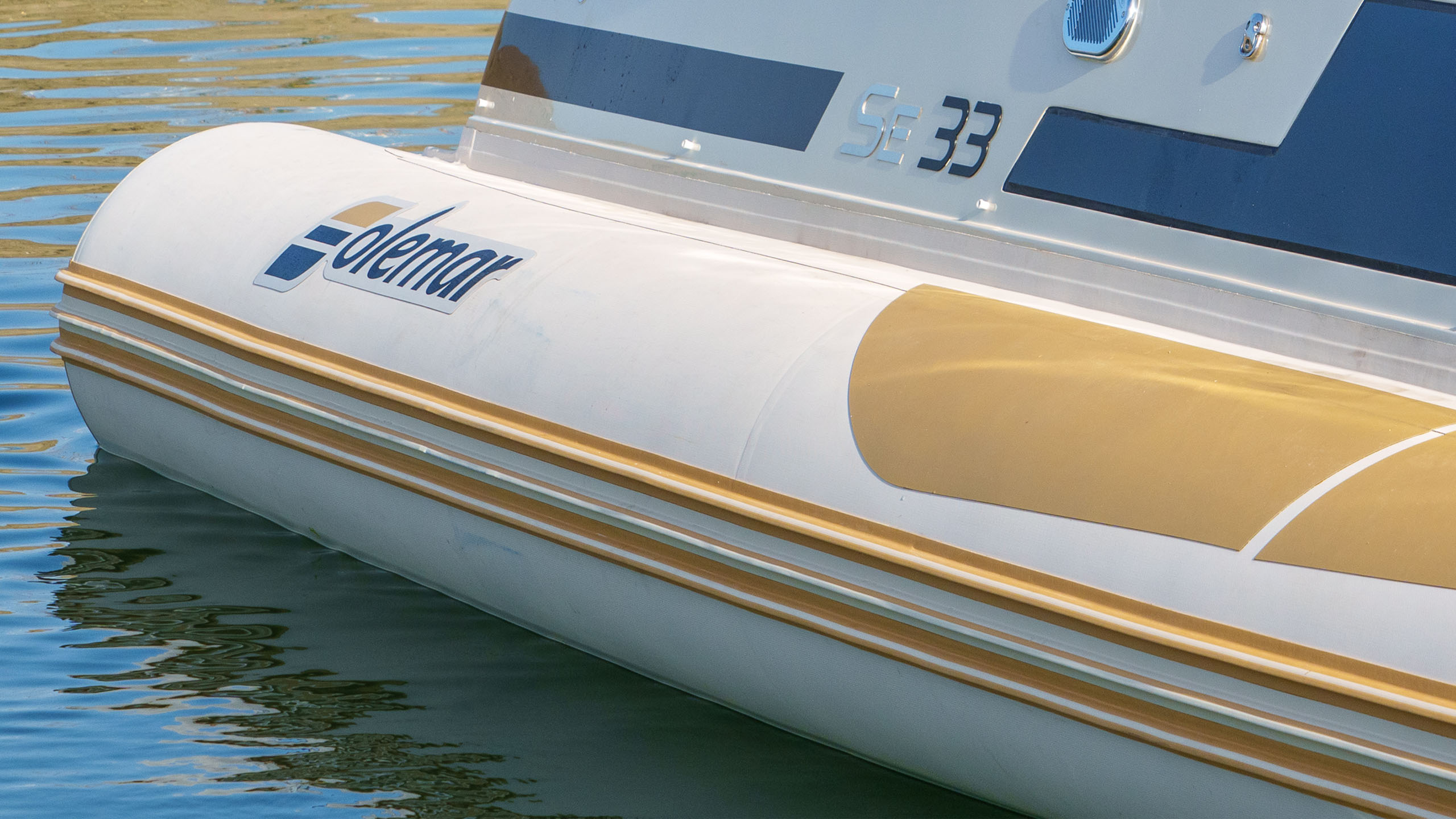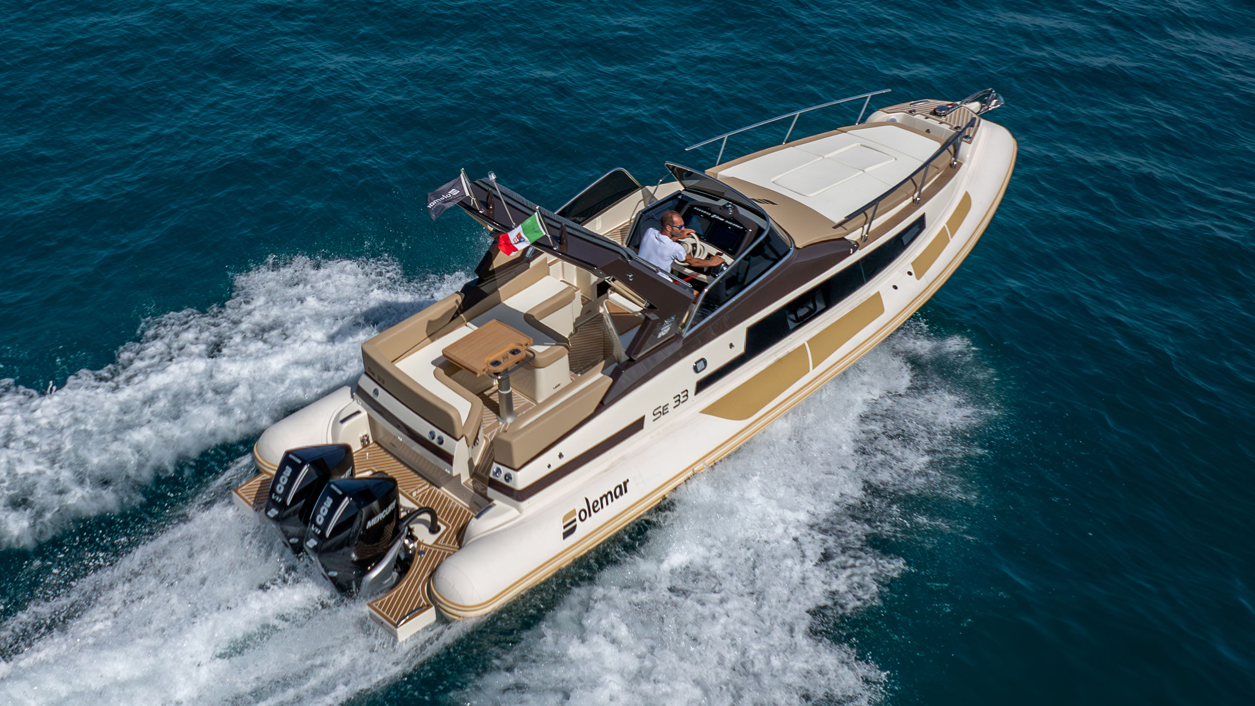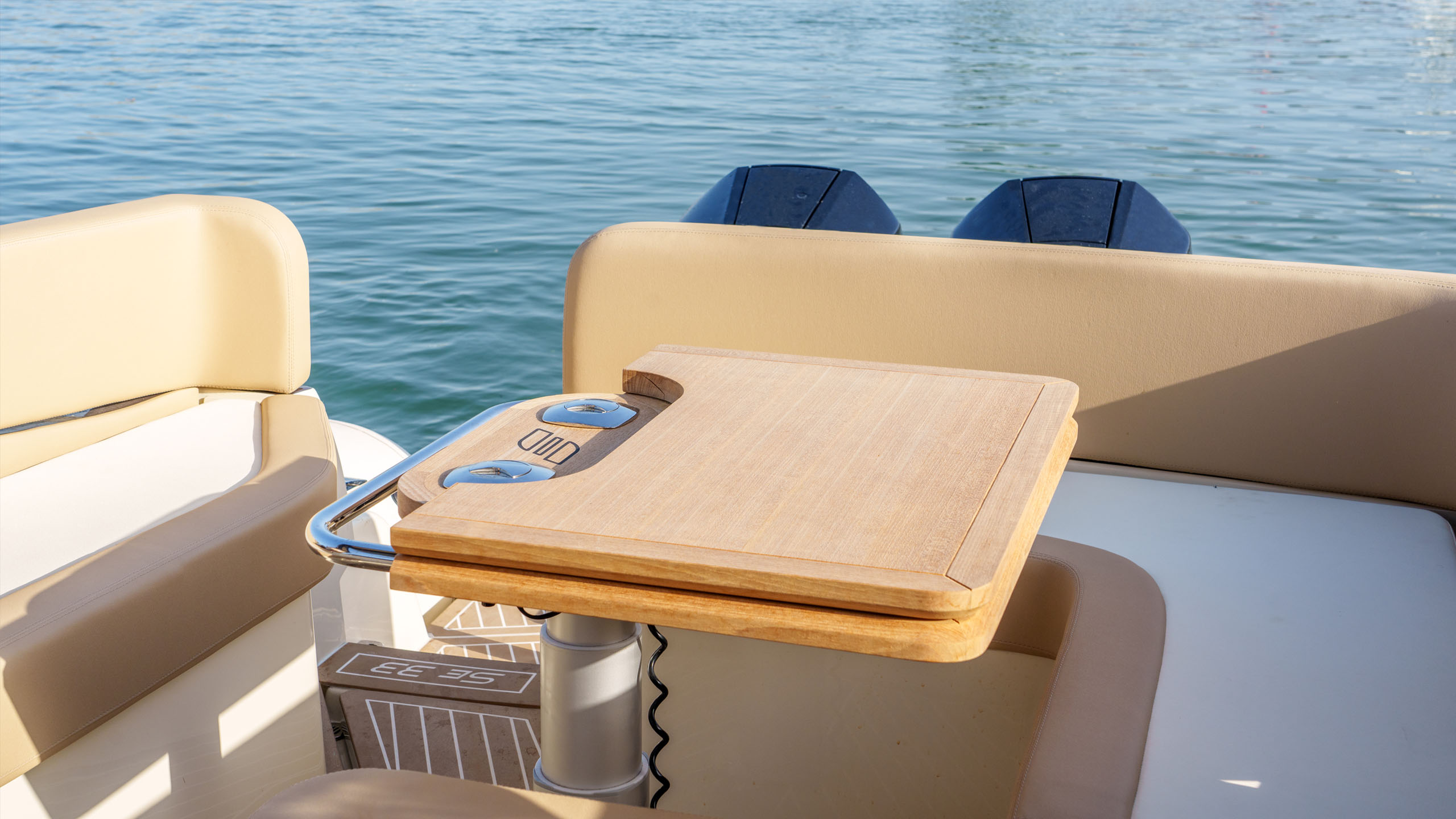 SE33, spinto da due motori fuoribordo da 300 CV ciascuno, presenta linee esterne decise ed armoniose, che favoriscono la marinità e la praticità di bordo. A prua troviamo i tienitibene che facilitano il passaggio e nella zona di poppa sono stati studiati schienali avvolgenti: entrambi elementi che contribuiscono a diffondere un senso di sicurezza a bordo in tutto il battello.