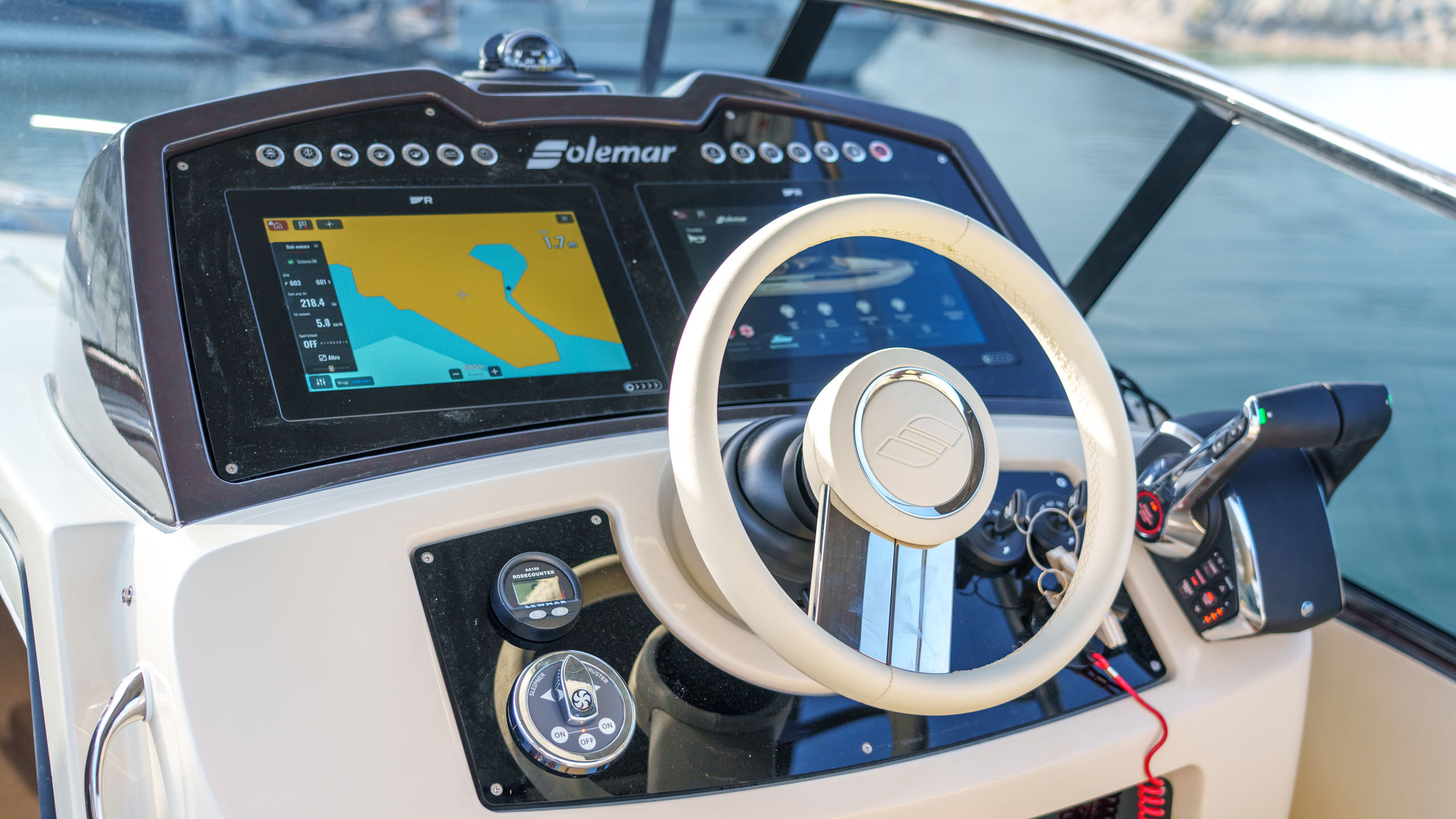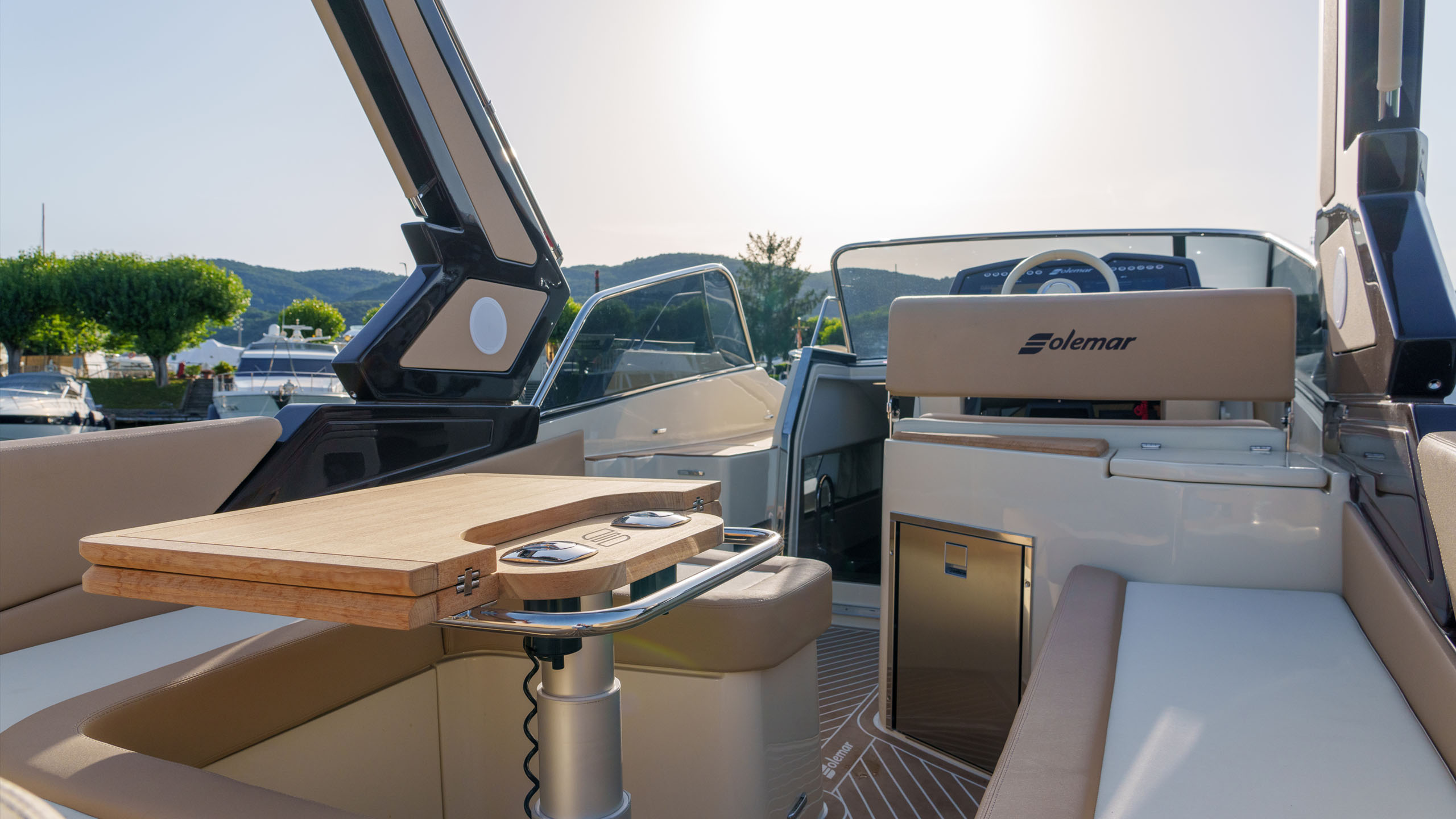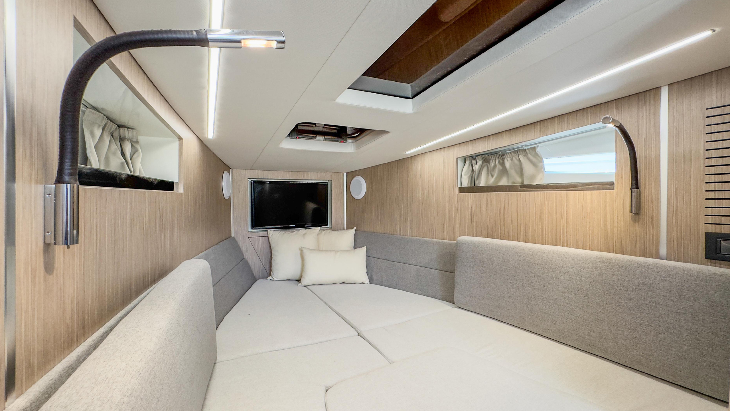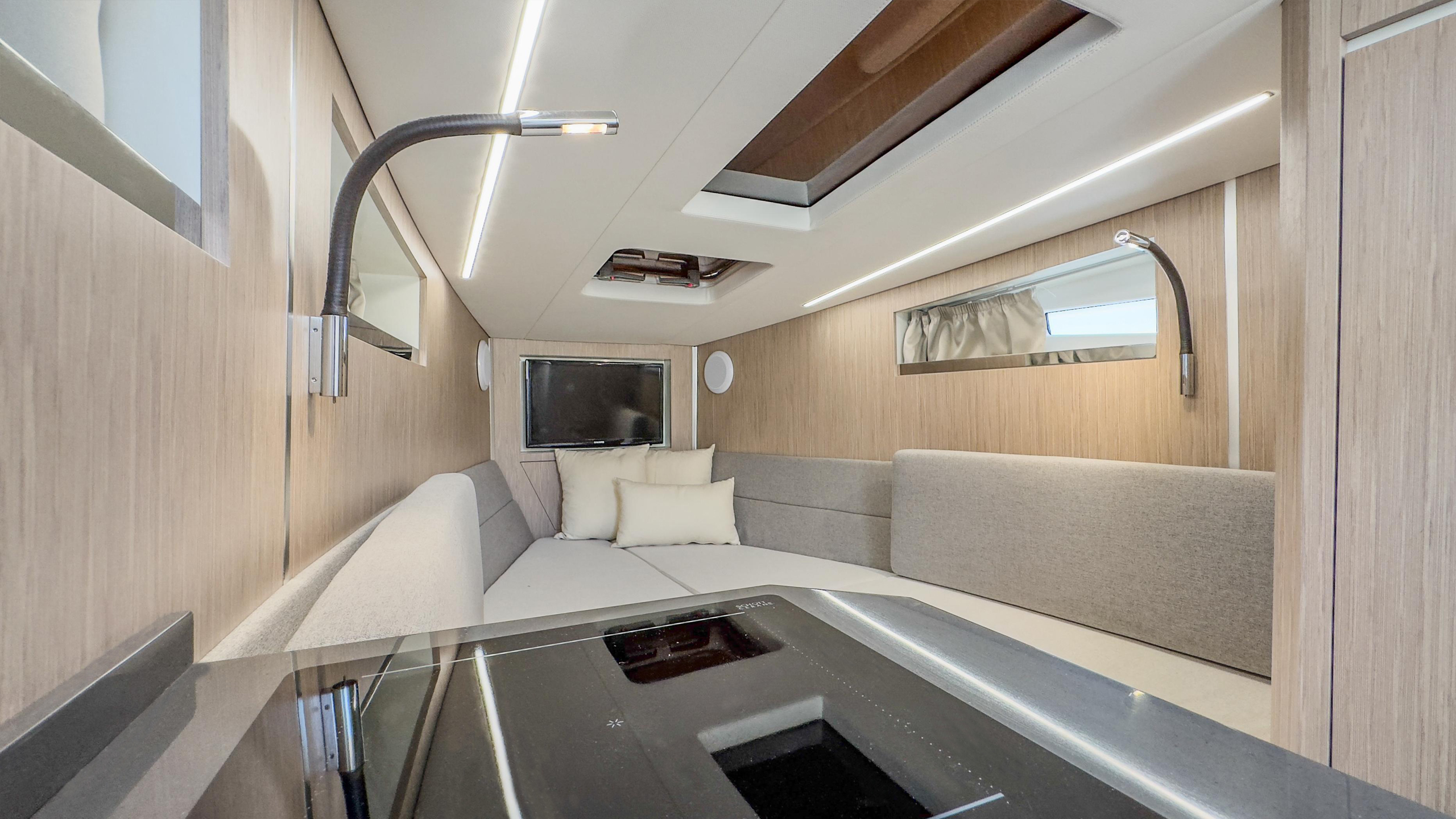 Nel pozzetto troviamo un divano a U con panca frontale, tavolo abbattibile che diventa un grande prendisole, cucina esterna, console di guida asimmetrica, ben organizzata e moderna, a lato della quale si accede alla zona sottocoperta.