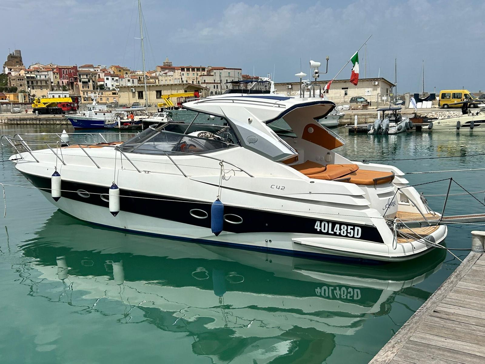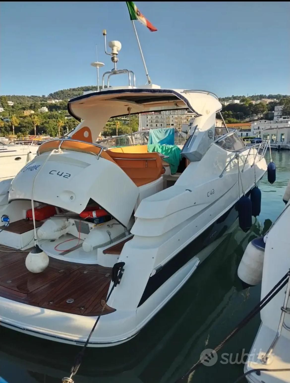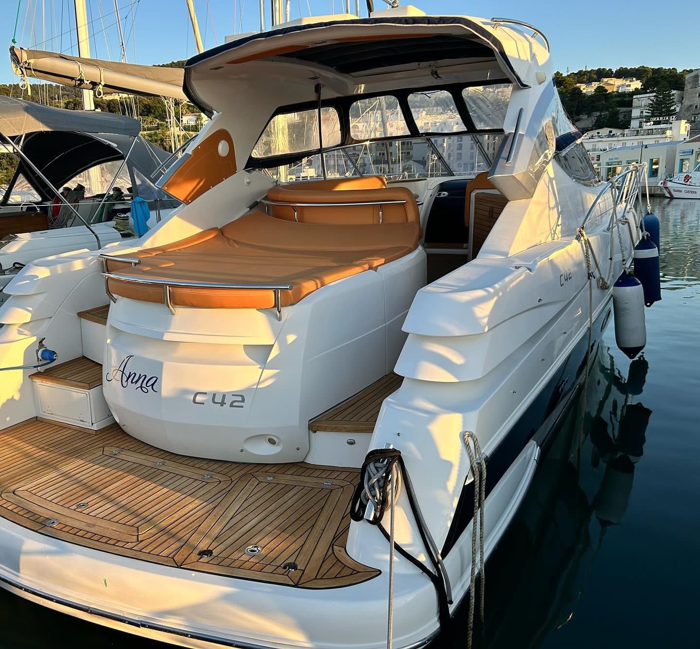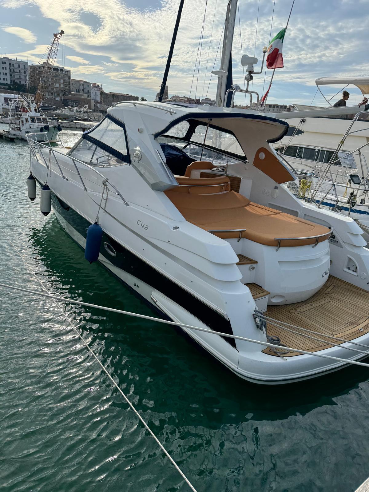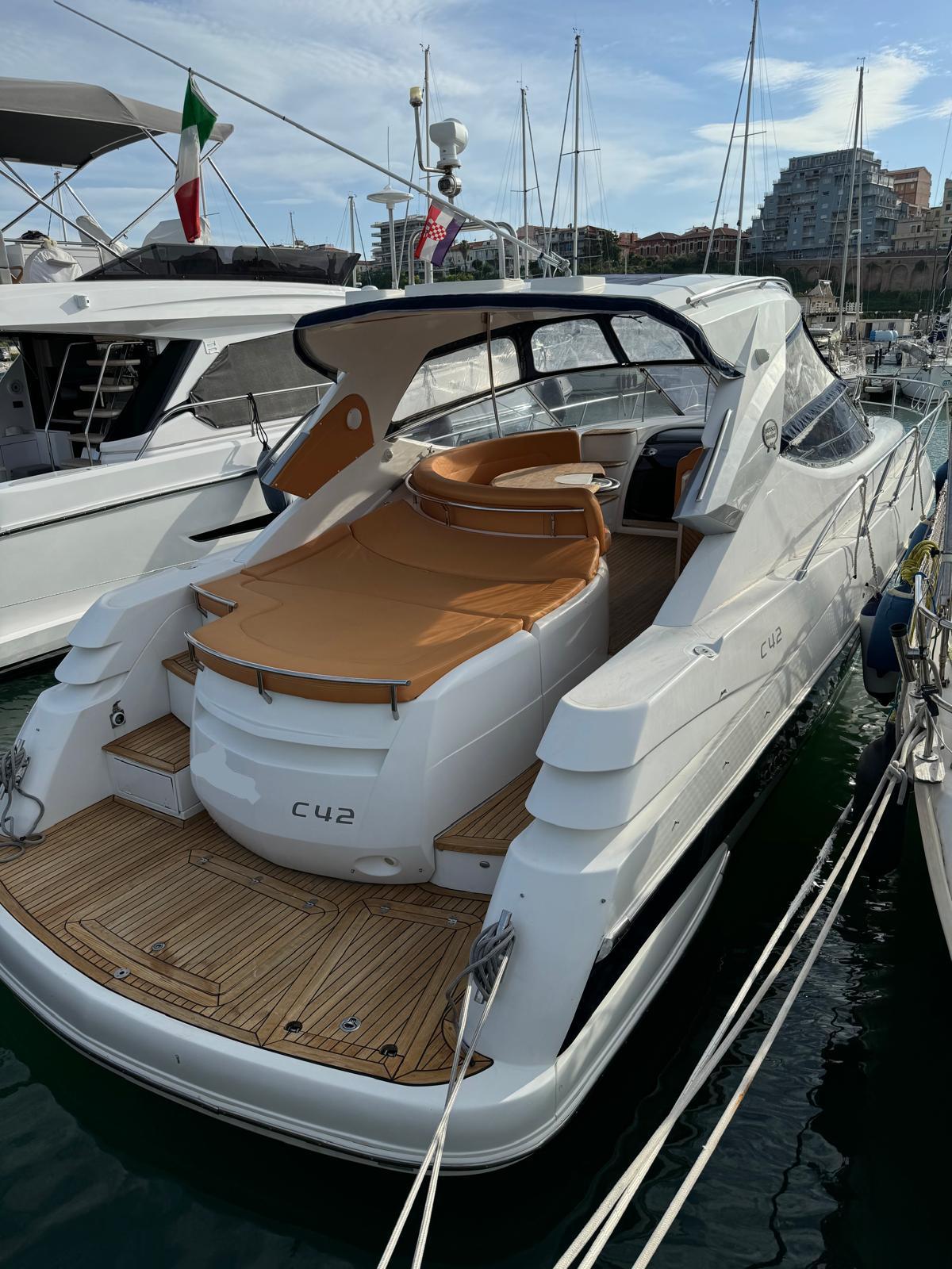 Sessa C 42 HT, Soft Top version, in excellent condition, powered by Volvo Penta D6 310. Very refined and elegant vessel, offering great space both inside and outside with two large sundecks fore and aft, comfortable C-shaped sofa with adjustable table. New closed-cell cushions of the latest series. New Teak decking, very convenient aft garage for tender storage and safety equipment. Besenzoni retractable gangway with remote control. Stern shower with hot and cold water, stainless steel retractable ladder, awning and canopy with total closure. Spacious interior, unique forward cabin with double bed, wardrobe, drawers and bathroom with electric toilet, sink and shower. Very generous aft cabin with double bed, wardrobe, drawers and bathroom with shower. Sofa, dinette convertible into third double bed. Full kitchen with stainless steel hob, multifunction oven, cooker, refrigerator, wooden table. Air conditioning with heat pump, hot-cold. Hydraulic steering, electronic throttles, bow thruster. Complete instrumentation: GPS navigator, depth sounder, VHF, stereo radio. Request 130,000+financing. The owner is selling for passage to a superior vehicle.