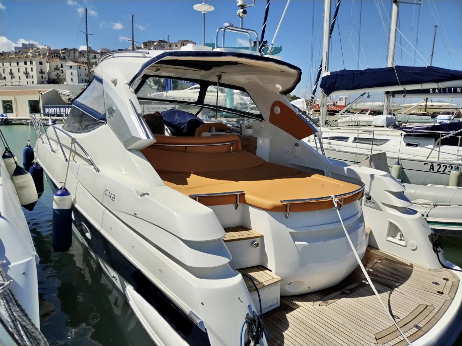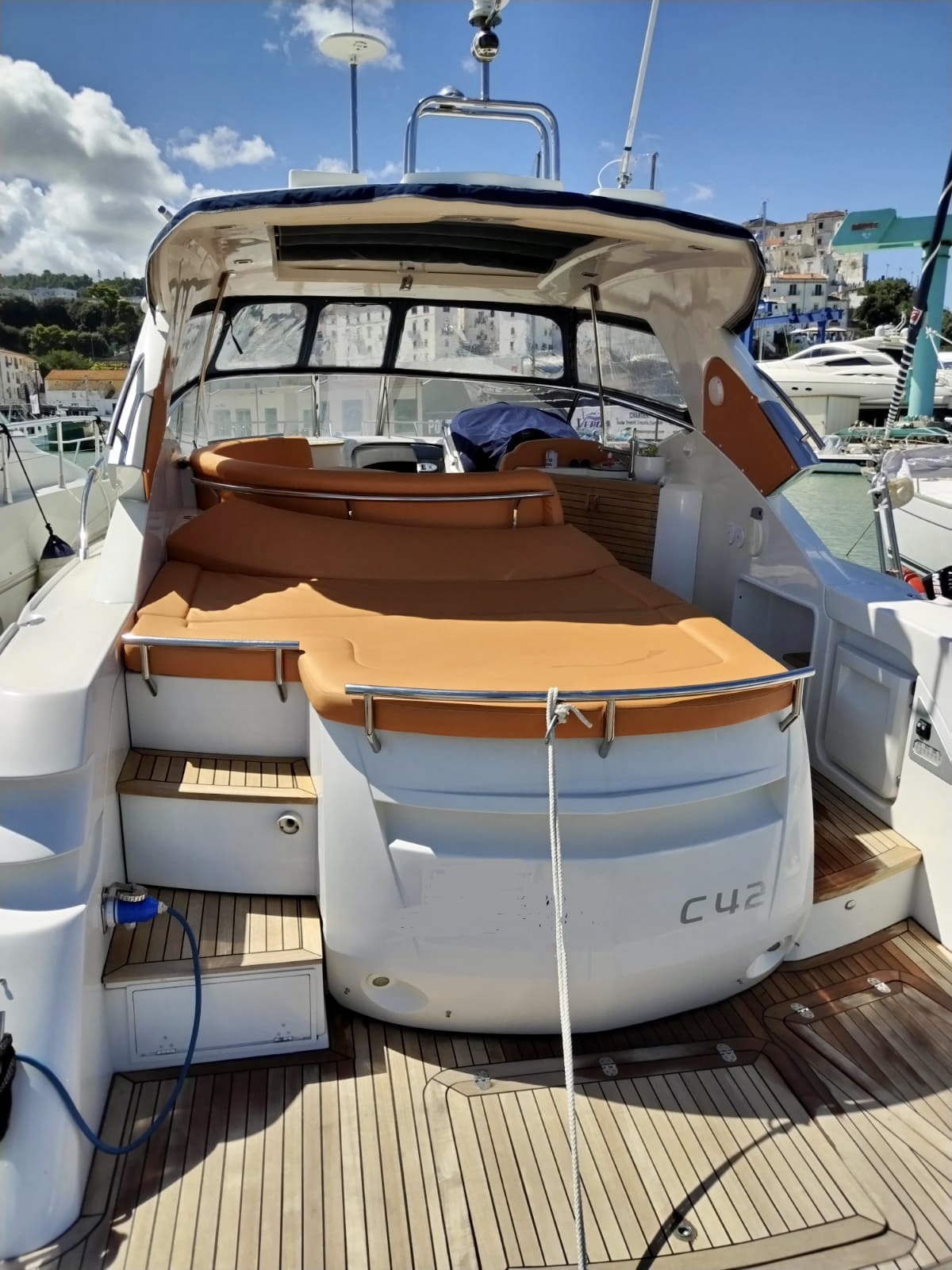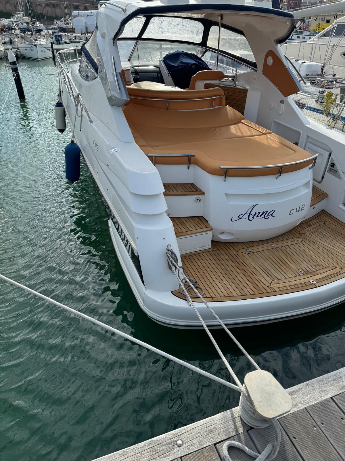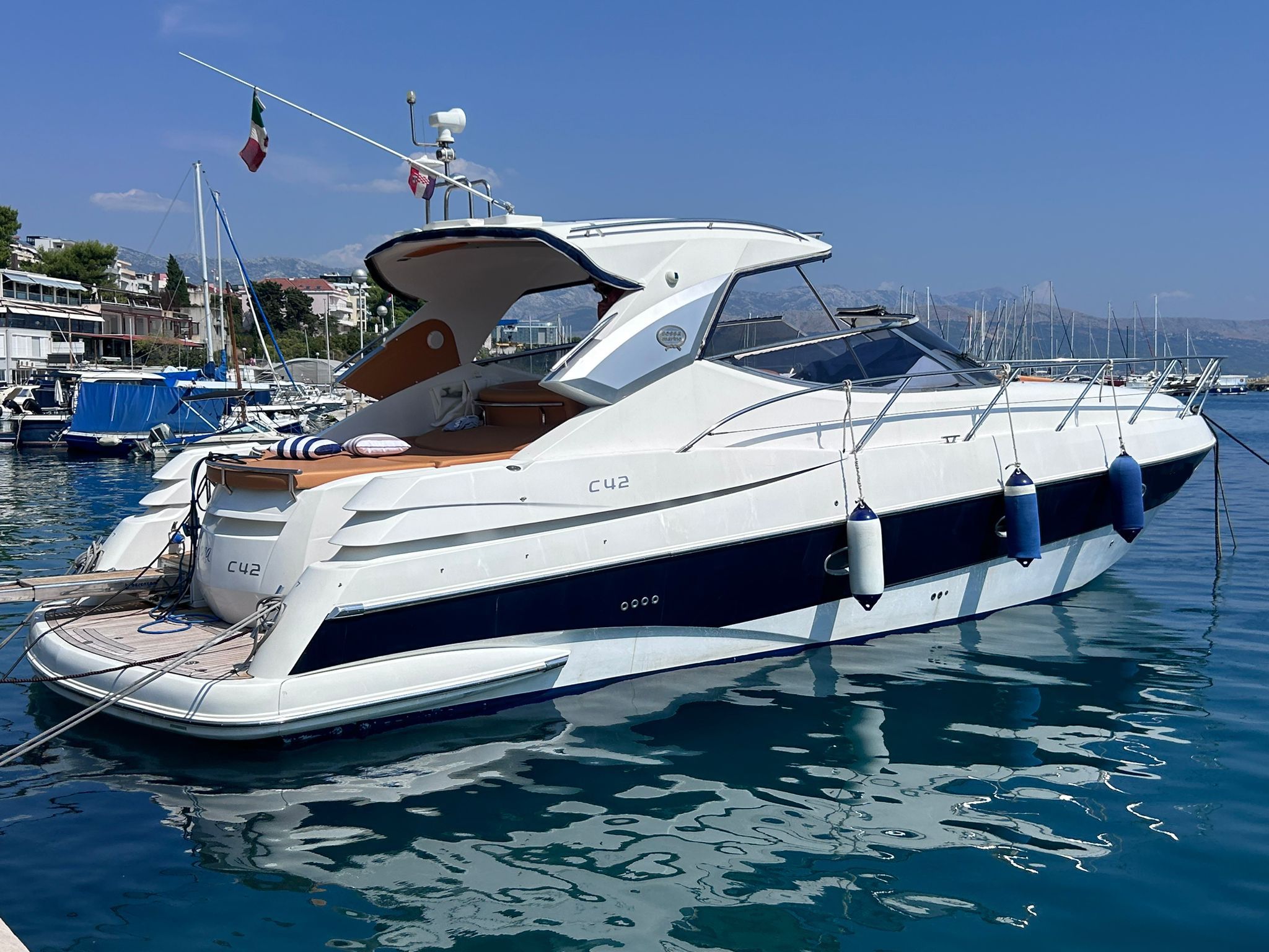 Sessa C 42 HT, Soft Top version, in excellent condition, powered by Volvo Penta D6 310. Very refined and elegant vessel, offering great space both inside and outside with two large sundecks fore and aft, comfortable C-shaped sofa with adjustable table. New closed-cell cushions of the latest series. New Teak decking, very convenient aft garage for tender storage and safety equipment. Besenzoni retractable gangway with remote control. Stern shower with hot and cold water, stainless steel retractable ladder, awning and canopy with total closure. Spacious interior, unique forward cabin with double bed, wardrobe, drawers and bathroom with electric toilet, sink and shower. Very generous aft cabin with double bed, wardrobe, drawers and bathroom with shower. Sofa, dinette convertible into third double bed. Full kitchen with stainless steel hob, multifunction oven, cooker, refrigerator, wooden table. Air conditioning with heat pump, hot-cold. Hydraulic steering, electronic throttles, bow thruster. Complete instrumentation: GPS navigator, depth sounder, VHF, stereo radio. Request 130,000+financing. The owner is selling for passage to a superior vehicle.