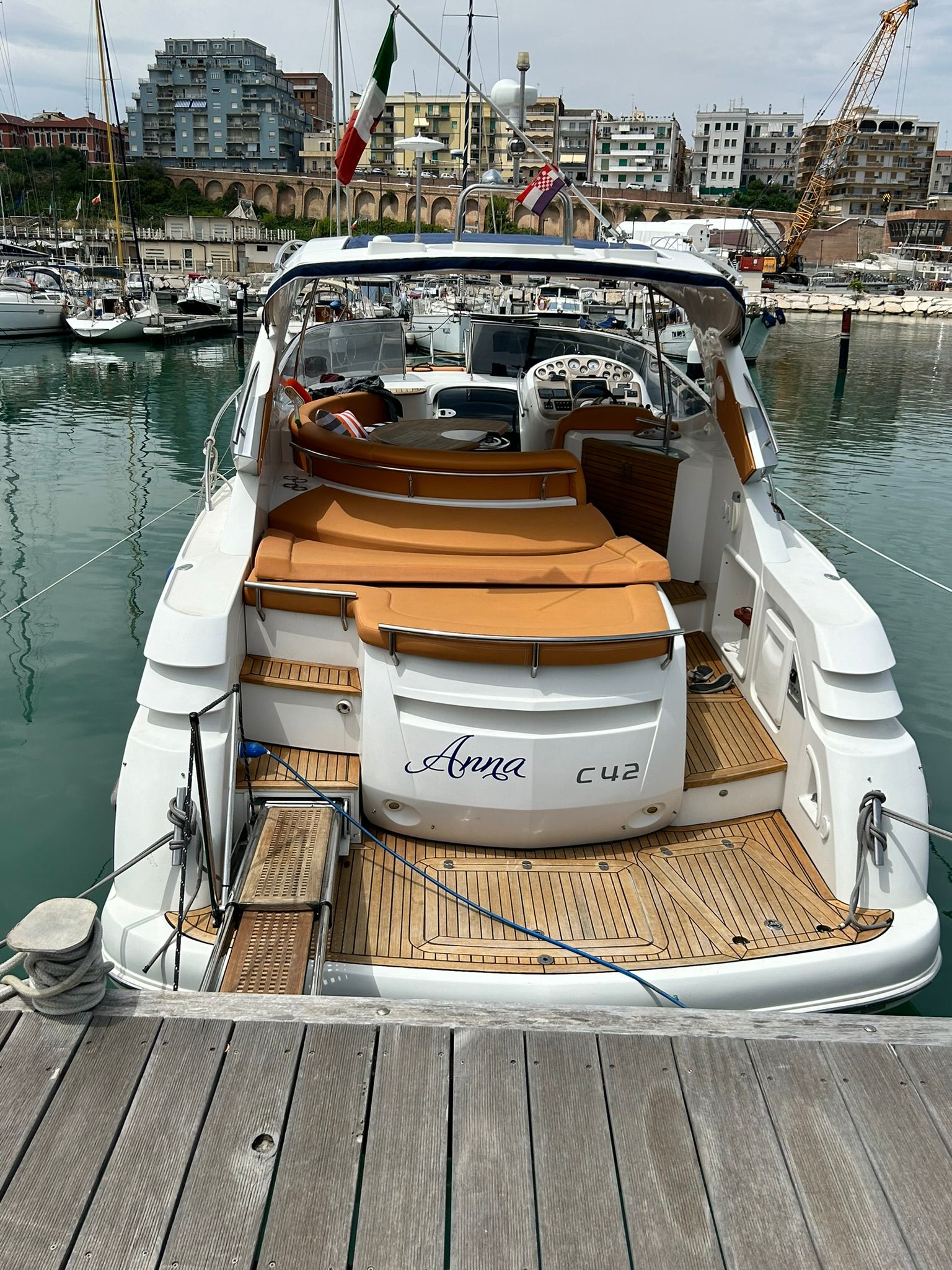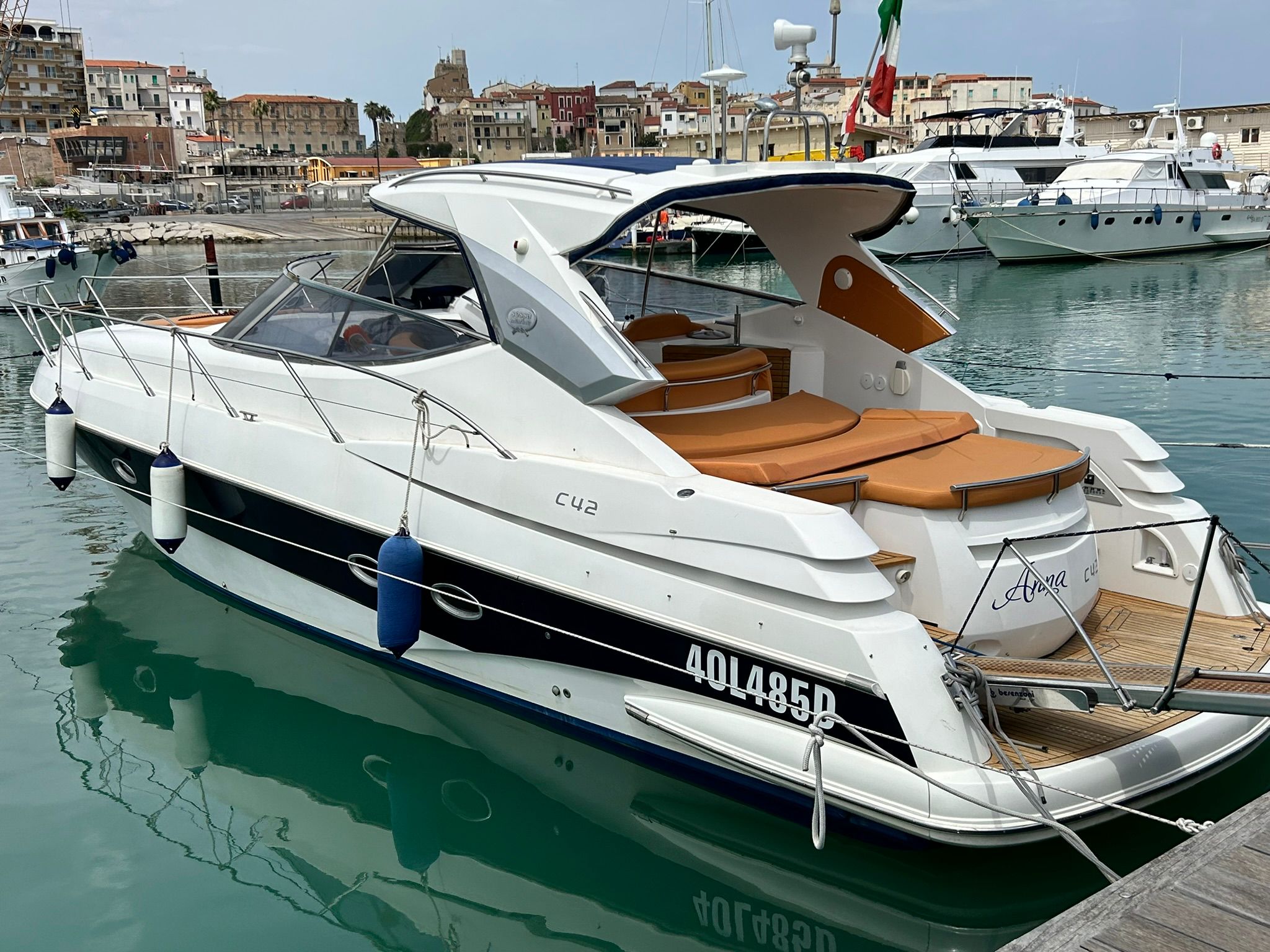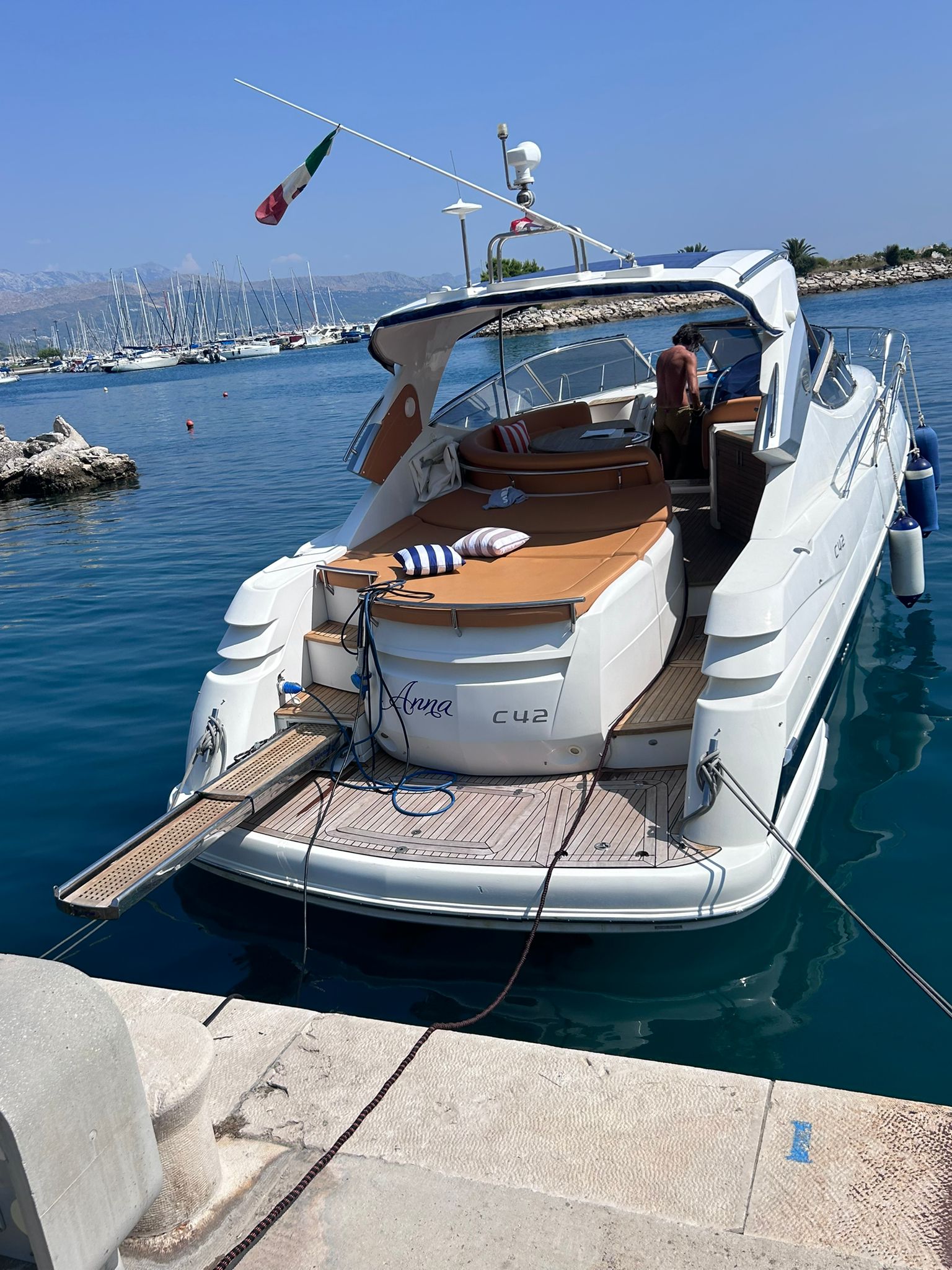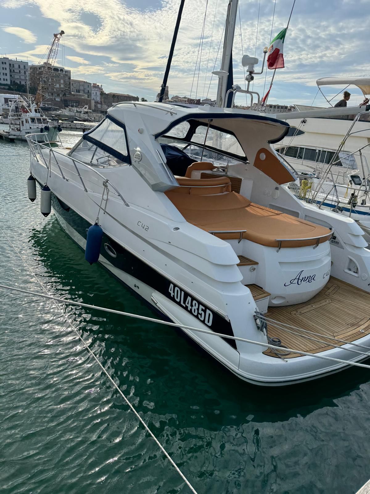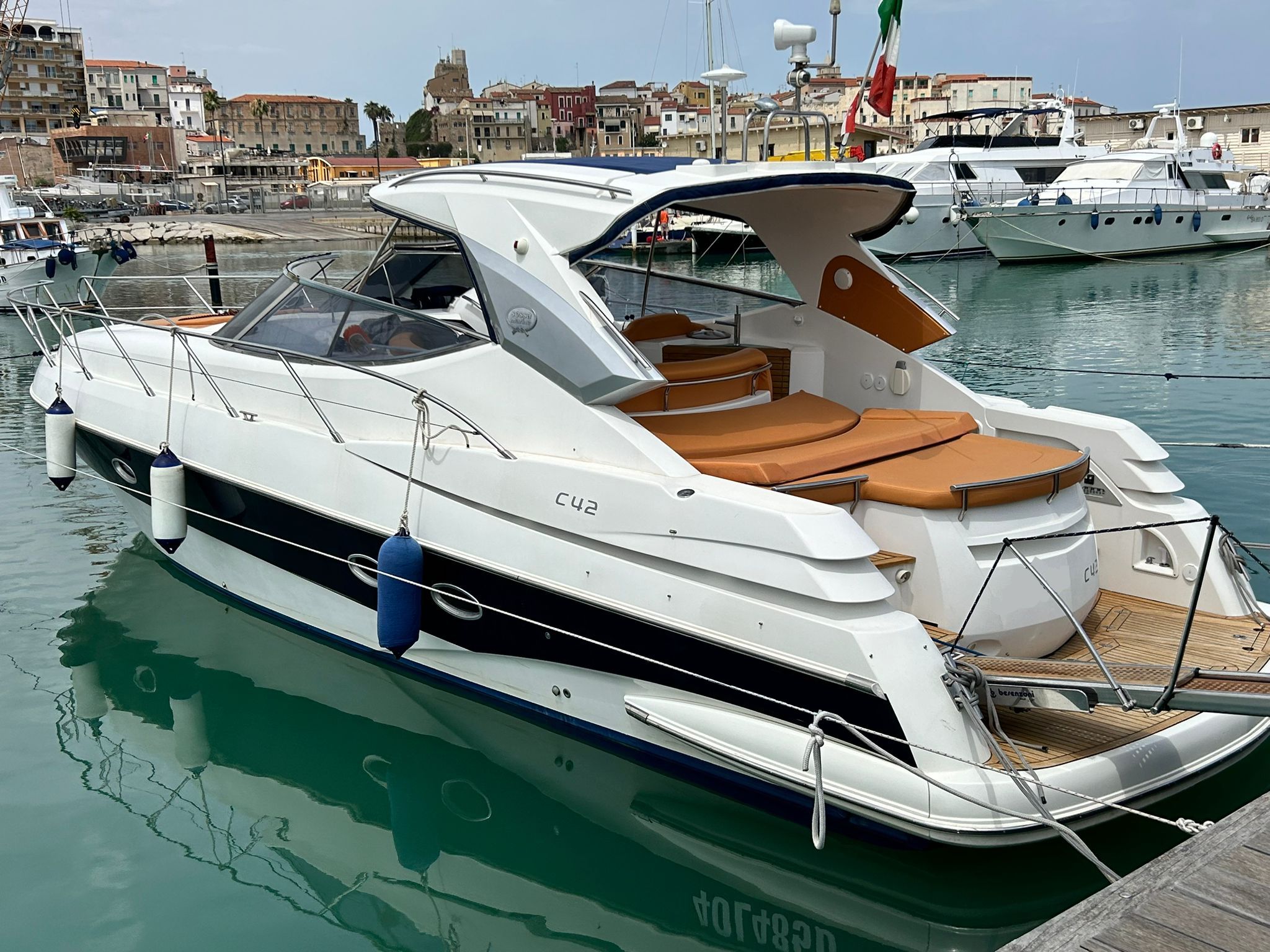 Sessa C 42 HT, Soft Top version, in excellent condition, powered by Volvo Penta D6 310. Very refined and elegant vessel, offering great space both inside and outside with two large sundecks fore and aft, comfortable C-shaped sofa with adjustable table. New closed-cell cushions of the latest series. New Teak decking, very convenient aft garage for tender storage and safety equipment. Besenzoni retractable gangway with remote control. Stern shower with hot and cold water, stainless steel retractable ladder, awning and canopy with total closure. Spacious interior, unique forward cabin with double bed, wardrobe, drawers and bathroom with electric toilet, sink and shower. Very generous aft cabin with double bed, wardrobe, drawers and bathroom with shower. Sofa, dinette convertible into third double bed. Full kitchen with stainless steel hob, multifunction oven, cooker, refrigerator, wooden table. Air conditioning with heat pump, hot-cold. Hydraulic steering, electronic throttles, bow thruster. Complete instrumentation: GPS navigator, depth sounder, VHF, stereo radio. Request 130,000+financing. The owner is selling for passage to a superior vehicle.